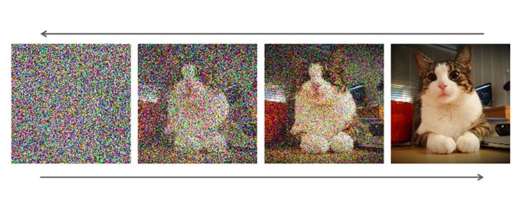 بعد ذلك، يتعلم الذكاء الاصطناعي الرسم باستخدام نماذج الانتشار (diffusion). يبدأ الأمر بصورة مليئة بالتشويش، مثل جهاز تلفزيون عند انقطاع الإشارة. وتدريجيًا، يتعلم الجهاز إزالة هذا التشويش لجعل الصورة أكثر وضوحًا وتفصيلاً.
